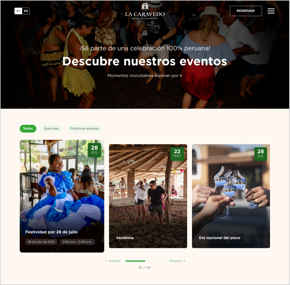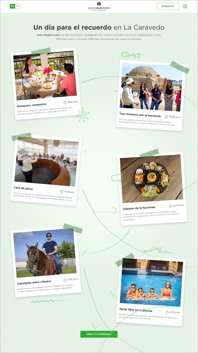 Definimos la estructura y storytelling del sitio, priorizando una navegación simple, orientada a concretar la reserva, haciendo énfasis en la tradición de la marca, sus icónicas catas de pisco y las experiencias que ofrece el hotel.